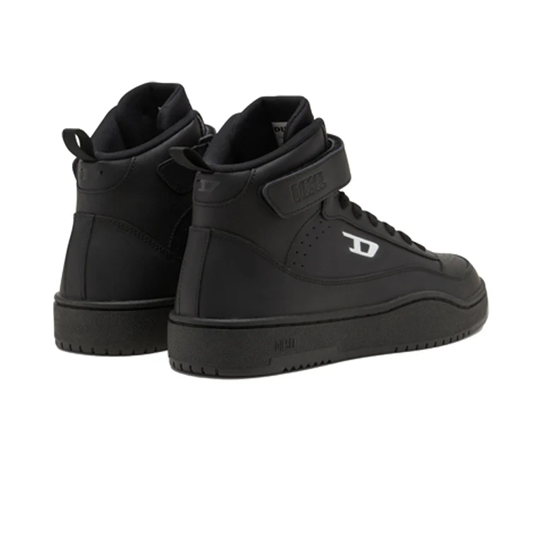 Men's mid top sneaker made of soft calfskin leather with avant garde details. The nineties inspired upper has a classic silhouette, with contrasting Diesel logos on the tongue at the side. A tonal Diesel logo also features on the velcro ankle strap. The chunky rubber sole has a custom tread.